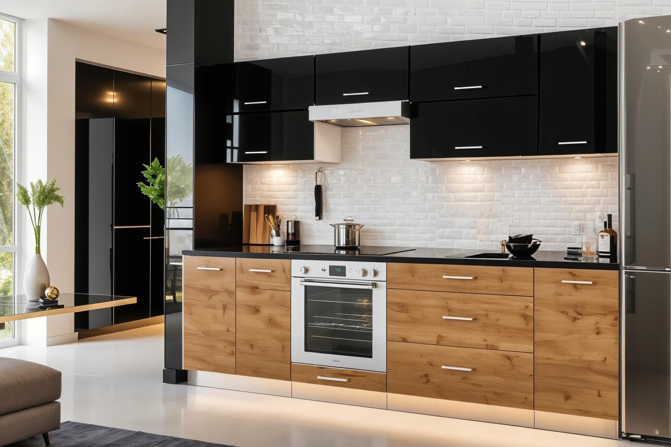 Kuchnia wyróżnia się nowoczesnym stylem, w którym czarne, połyskliwe fronty górnych szafek dodają elegancji i wyrazistości, a dolne szafki w ciepłym odcieniu dębu Wotan wprowadzają naturalny, subtelnie surowy akcent. Kontrast między ciemną górą a drewnianym dołem tworzy efektowną harmonię, łącząc nowoczesność z przytulnym charakterem drewna. Blat w odcieniu grafitowego betonu doskonale komponuje się z całością, podkreślając industrialny akcent wnętrza i dodając mu nowoczesnego, loftowego charakteru. Minimalistyczne uchwyty dopełniają spójny design, zapewniając zarówno styl, jak i wygodę użytkowania. To kuchnia, która zachwyca elegancją, funkcjonalnością i ponadczasowym stylem.