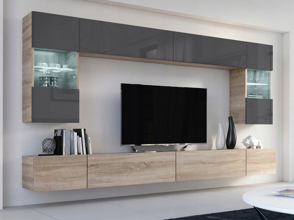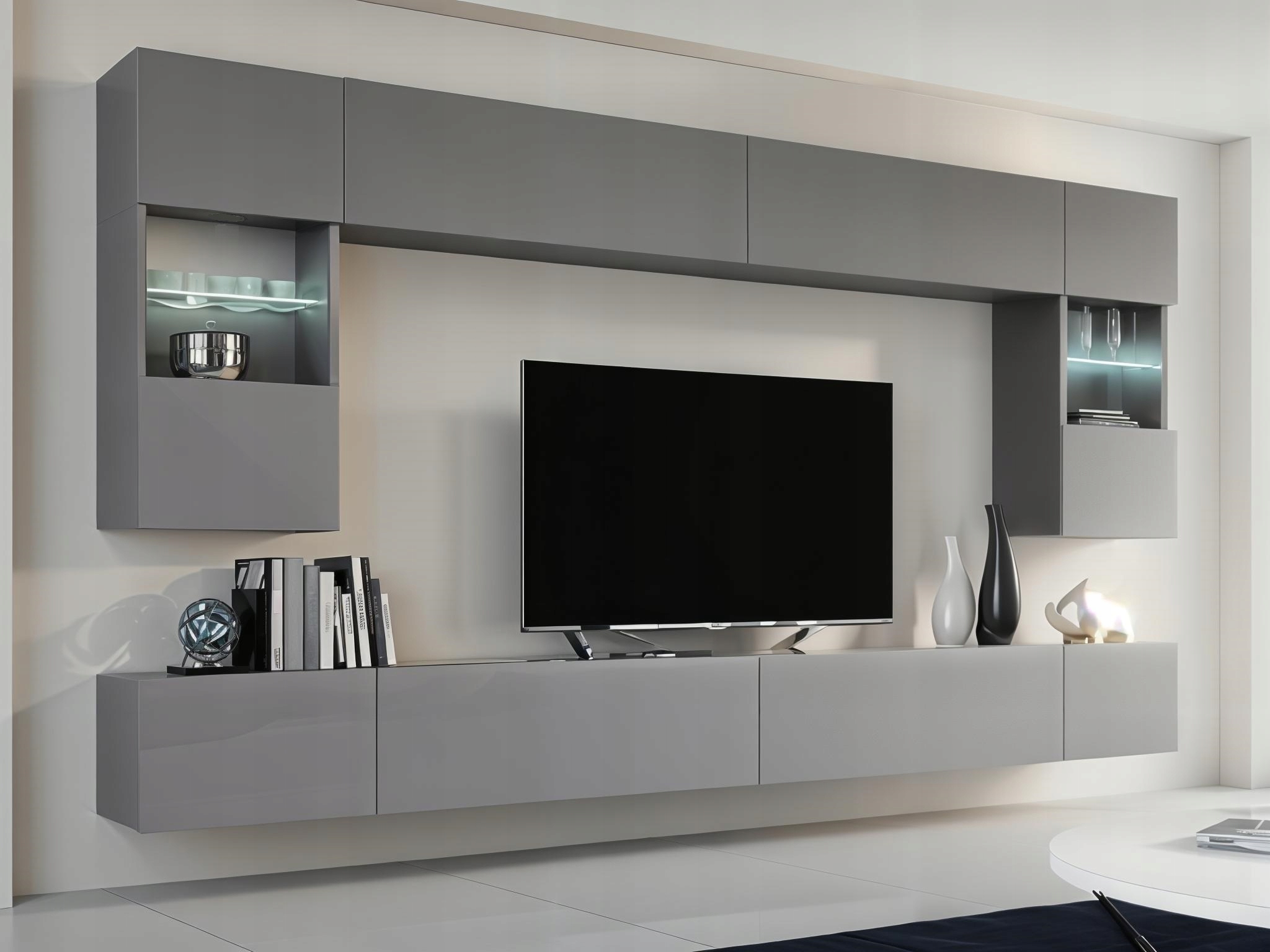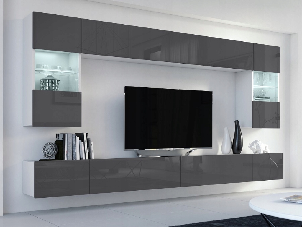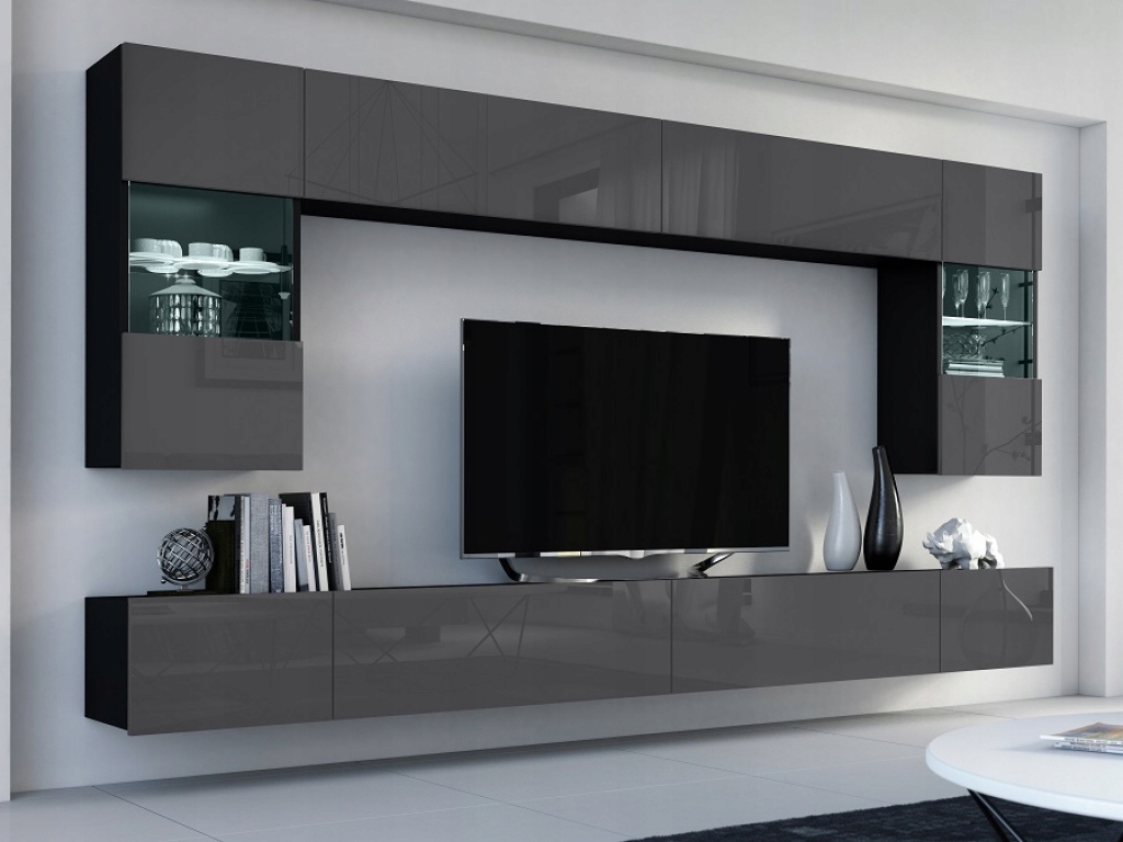 Elegancka, nowoczesna meblościanka w modnym odcieniu szarości o matowym wykończeniu. Kupując u nas, dokonujesz zakupu bezpośrednio u producenta, omijając pośredników.